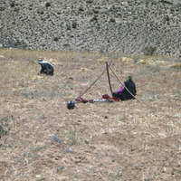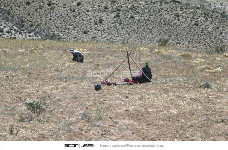 Jordan. Petra, family of Sahlim Im-Mohammed hand-harvesting barley south of Petra. Note tripod butter churn, used to sling baby from as "babysitter"