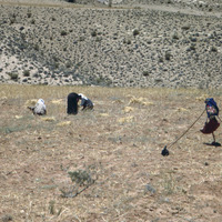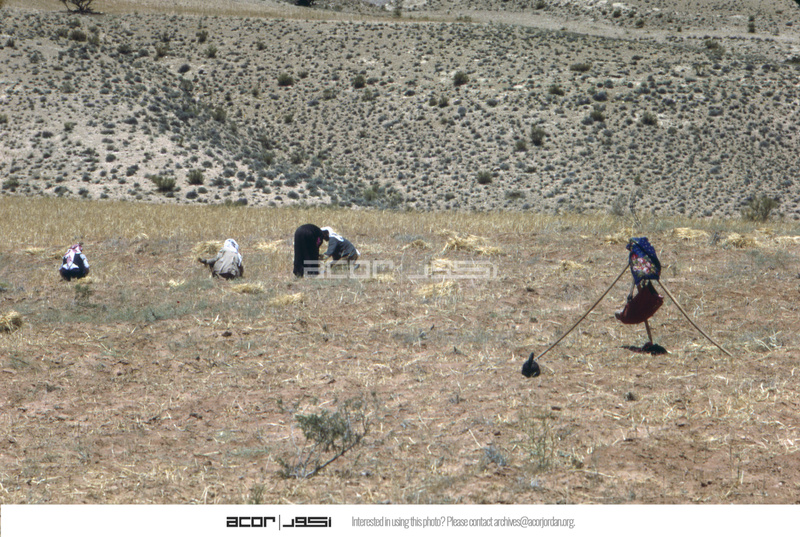 Jordan. Petra, family of Sahlim Im-Mohammed hand-harvesting barley south of Petra. Note baby slung in butter-churn tripod