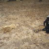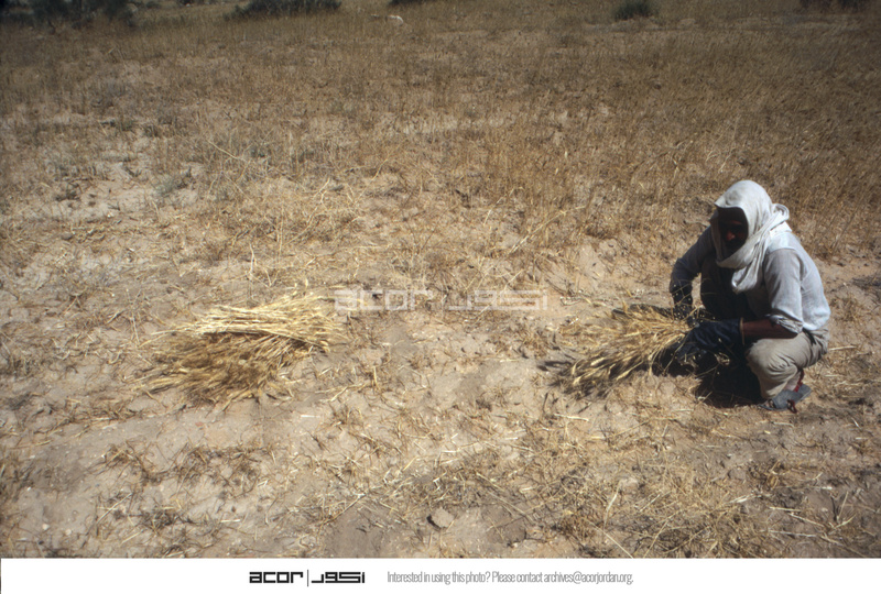 Jordan. Petra, hand-harvesting wheat from field of sample #1. Ras Wadi Muesra (E). Note use of rubber gloves