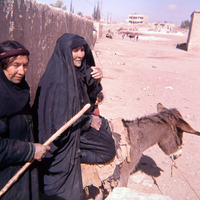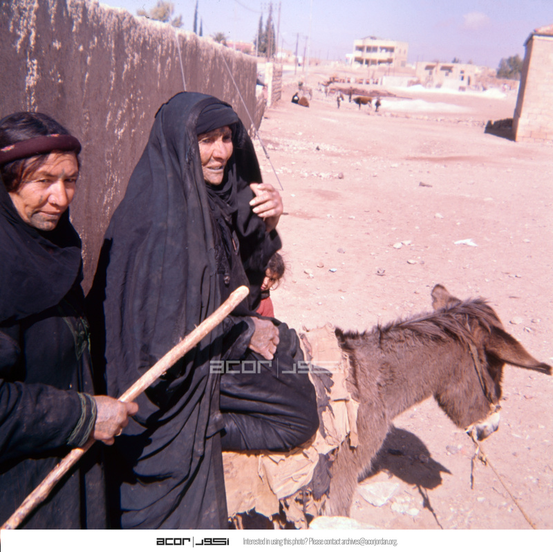 Jordan. Iraq al-Amir, village women and donkey