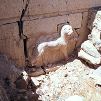 Jordan. Iraq al-Amir, feline fountain in first course of Qasr al-Abd east wall