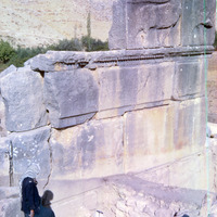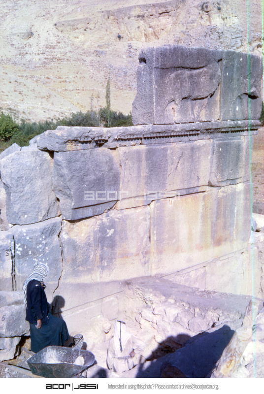Jordan. Iraq al-Amir, feline fountain being cleared in first course of Qasr al-Abd east wall