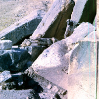 Jordan. Iraq al-Amir, looking west at southwest end of Qasr al-Abd and lion block before turned over