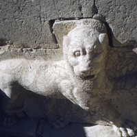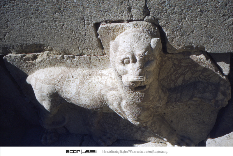 Jordan. Iraq al-Amir, Qasr al-Abd, closeup of feline fountain with wall removed