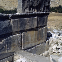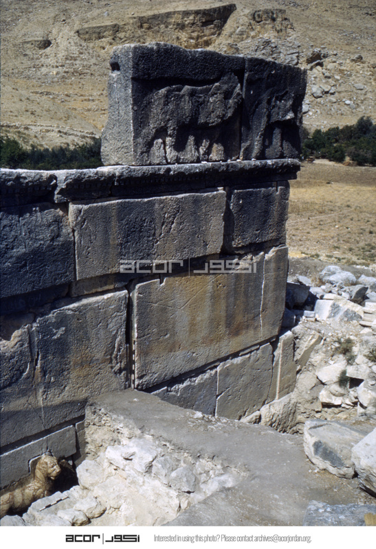 Jordan. Iraq al-Amir, feline fountain behind Byzantine wall of Qasr Al-Abd (bottom left), wall frieze (top right)