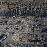 Jordan. Iraq al-Amir, looking north at excavation in village. Camp and caves behind