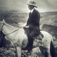 Jordan. Reverend Kyle G. Kelso on horse in front of mountains in Ghawr es Safi