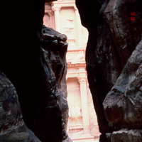 Jordan. Petra, Khaznet Far'oun (Treasury) from Siq
