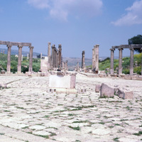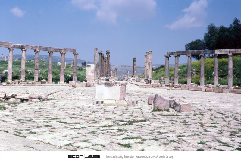 Jordan. Jerash, looking north at Forum and down colonnaded street (Cardo maximus)