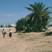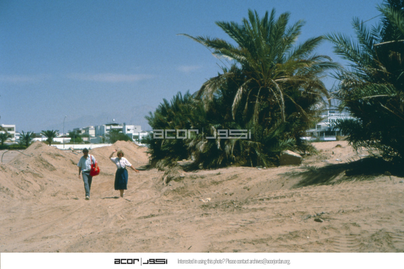 Jordan. Aqaba, sand bulldozed away from ramparts of Ayla's southwest quadrant; Andrea Lain and husband