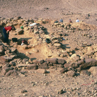 Jordan. Wadi Khanazir, excavated structure; note that tomb chamber is being excavated in it's center. Nancy Lapp in red