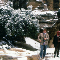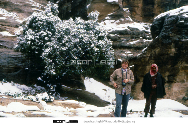 Jordan. Petra, Siq el Barid / Little Petra, snow scene, Sally de Vries on left