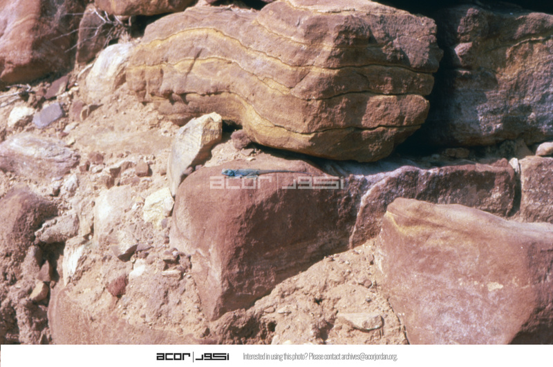 Jordan. Petra, blue lizzard on High Place Temple masonry