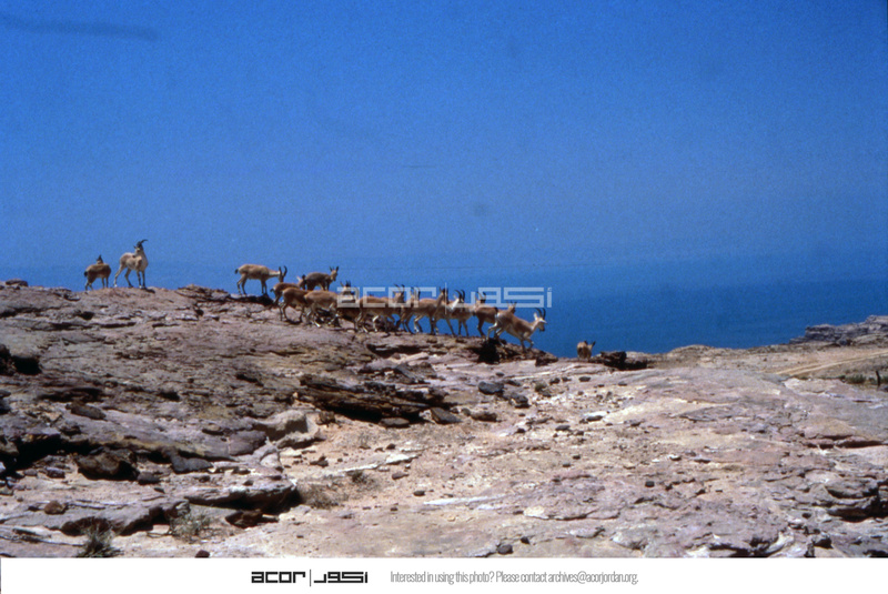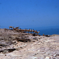 Jordan. Wadi Mujib, game preserve, young ibex herd with Dead Sea in background