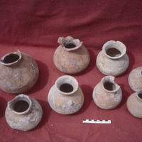 Jordan. Bab edh-Dhra' cemetery, roadside trench tomb pottery photographed at Karak. Small jars 30, 37, 45, 08 (back) and 10, 01, 19, 80, 77 (front)