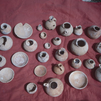 Jordan. Bab edh-Dhra' cemetery, roadside trench tomb pottery photographed at Karak. All the pots except three