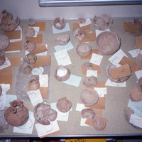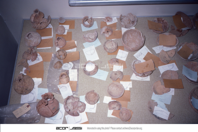 Jordan. Bab edh-Dhra' cemetery, roadside trench tomb. Reconstructed pottery study at Pittsburgh Theological Seminary, jugs and bowls