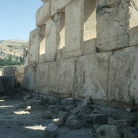 Jordan. Iraq al-Amir, looking north at Qasr al-Abd west wall reconstruction from outside