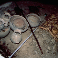 Jordan. Bab edh-Dhra', Cemetery A, Tomb A114. Wooden staff angled over tape measure plus other wooden objects