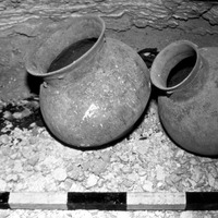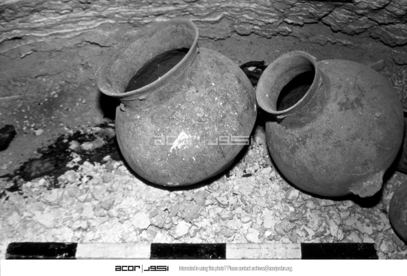 Jordan. Bab edh-Dhra', Cemetery A, Tomb A76E. Closeup of pots in front of basket fragments