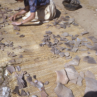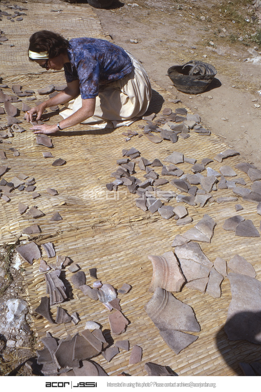 Jordan. Tall er-Rumeith, Marilyn Schaub sorting potsherds