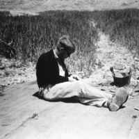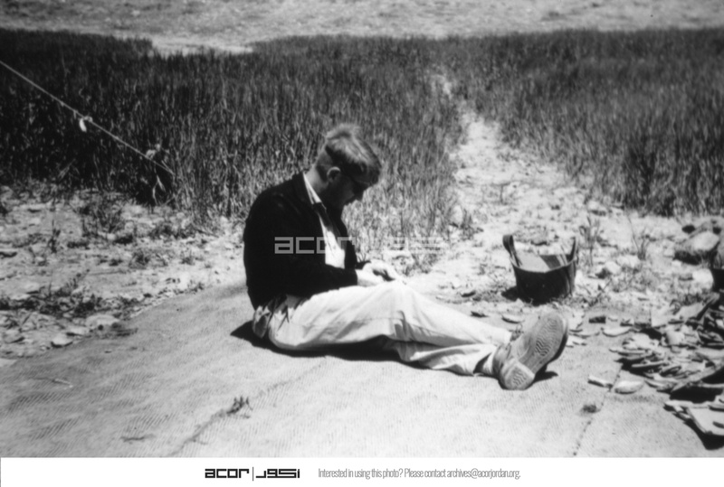 Jordan. Tell er-Rumeith, Paul Lapp examining pottery