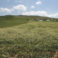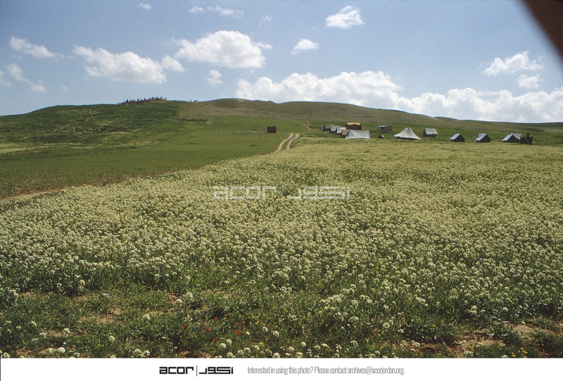 Jordan. Tell er-Rumeith, tell with camp in springtime
