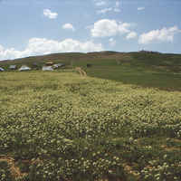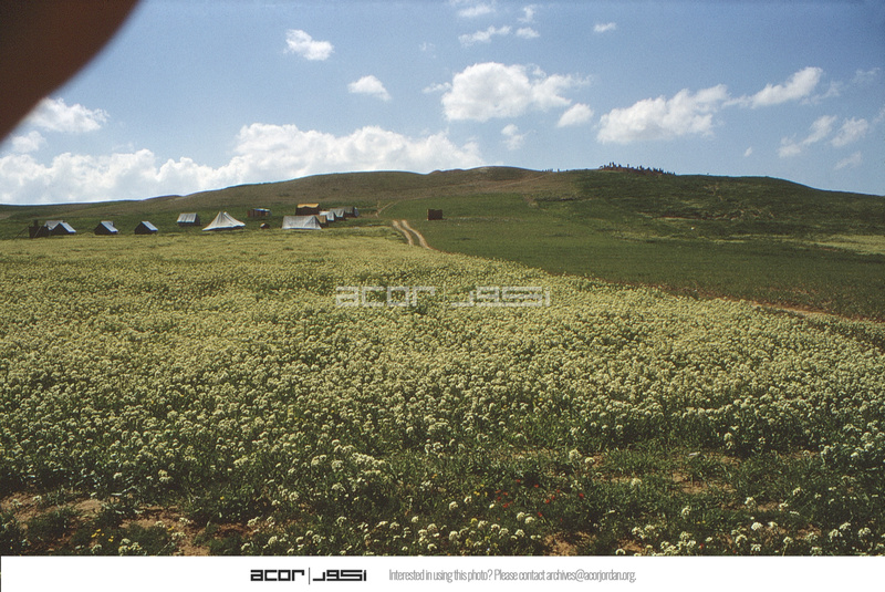 Jordan. Tell er-Rumeith, tell with camp in springtime