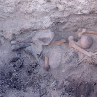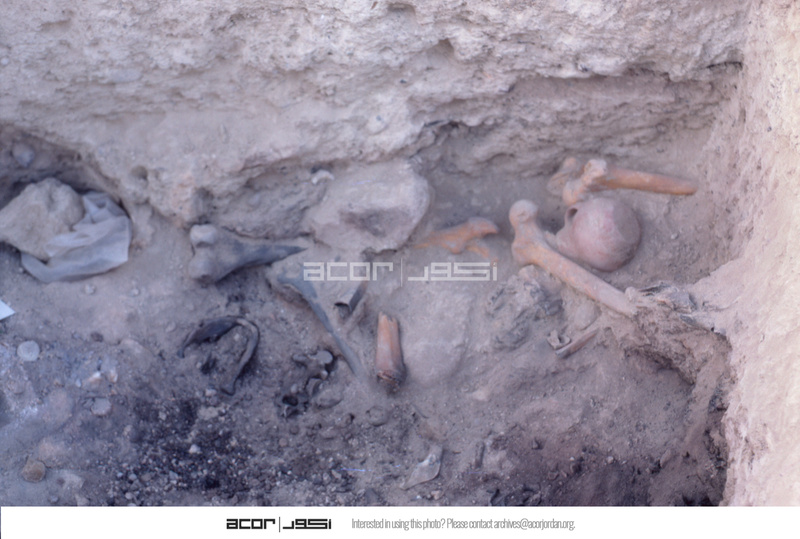 Jordan. Bab edh-Dhra', Cemetery A, Charnel House A22 excavations. Large long bones and pots in D2