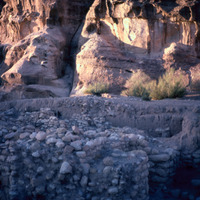 Beidha: The excavated Stone Age village of Beidha, one kilometer south west of Siq al-Barid, Beidha,the white one' in Arabic, dates from the period at the end of the Stone Age known as the Neolithic era, when people in the Near East making the slow, gradual transition from small groups of nomadic hunter-gatherers to settled villagers who domesticated animals and cultivated plants. It was excavated by Mrs. Diana Kirkbride. (Khouri, R. "Petra: a guide to the capital of the Nabataeans" 1986)