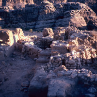 Beidha: The excavated Stone Age village of Beidha, one kilometer south west of Siq al-Barid, Beidha,the white one' in Arabic, dates from the period at the end of the Stone Age known as the Neolithic era, when people in the Near East making the slow, gradual transition from small groups of nomadic hunter-gatherers to settled villagers who domesticated animals and cultivated plants. It was excavated by Mrs. Diana Kirkbride. (Khouri, R. "Petra: a guide to the capital of the Nabataeans" 1986)
