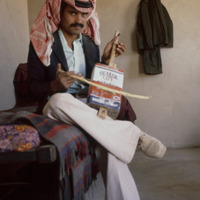 Jordan. Qasr al-Kharanah, man playing instrument made of Quaker city packet/tin