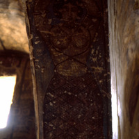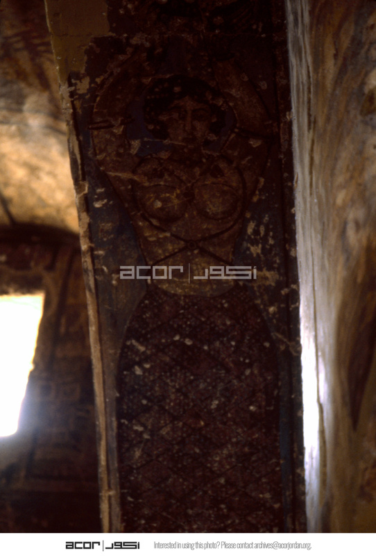 Jordan. Qasr Amra, torso of the female figure holding the medallion with the portrait of the caliph or prince on the soffit of the east arch of the great hall