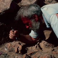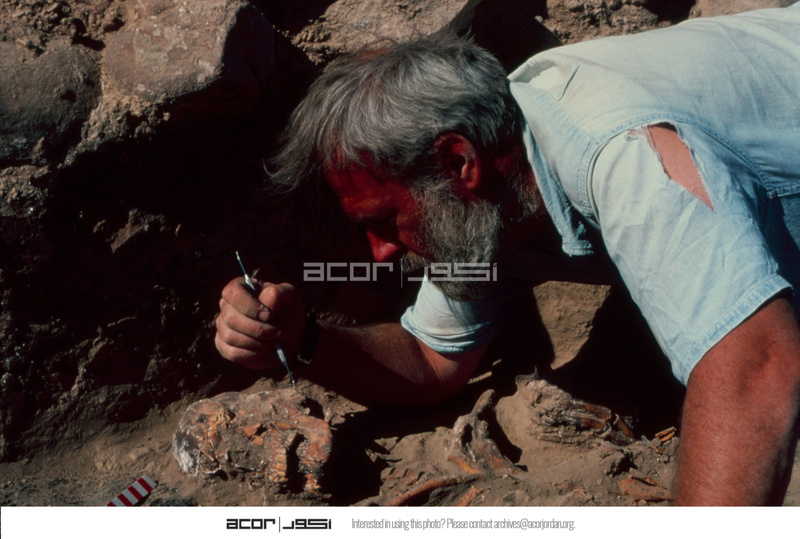 Jordan. Numeira, individual in earlier destruction level, in room of 'tower'. Mike Finnegan cleaning skull