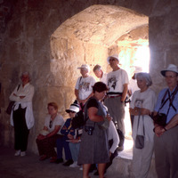 Jordan. Ajlun, tour group prayer inside Ajlun Castle