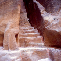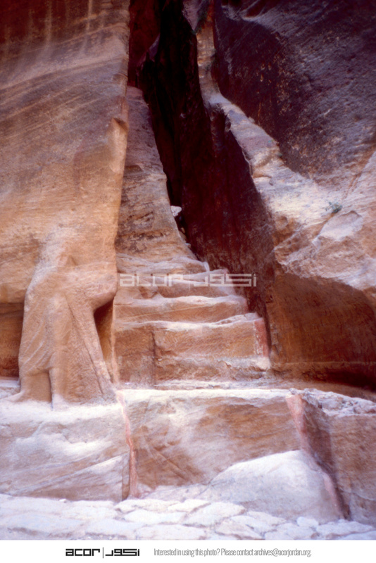 Jordan. Petra, Siq, reliefs of camels and cameleer, staircase to right