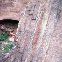 Jordan. Petra, pointing to Nabataean step design over tomb