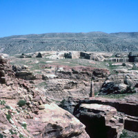 Jordan. Petra, obelisks near High Place of Sacrifice, remains of Nabataean fort to left