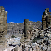 Jordan. Petra, looking through Triumphal Arch down Colonnaded street toward Royal Tombs