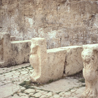 Jordan. Jerash. Macellum (Agora), decorated mensa legs inserted in a Byzantine structure
