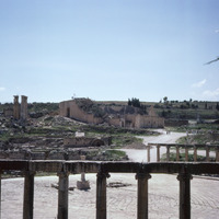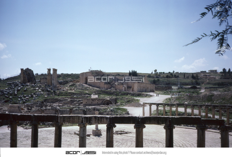 Jordan. Jerash, looking across Forum to South Theater and Temple of Zeus (Jupiter) (معبد زيوس)