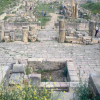 Jordan. Jerash, the Fountain Court with ruins of the Cathedral beyond
