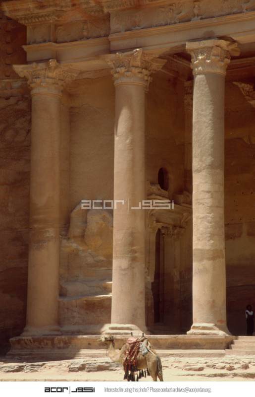 Jordan. Petra, Khaznet Far'oun (Treasury), lower order, north (right) man with camel
