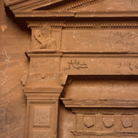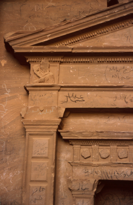 Jordan. Petra, interior of a chamber no. 468, busts of figure holding a torch carved near the outside corners and a small pediment with acroteria