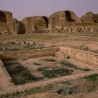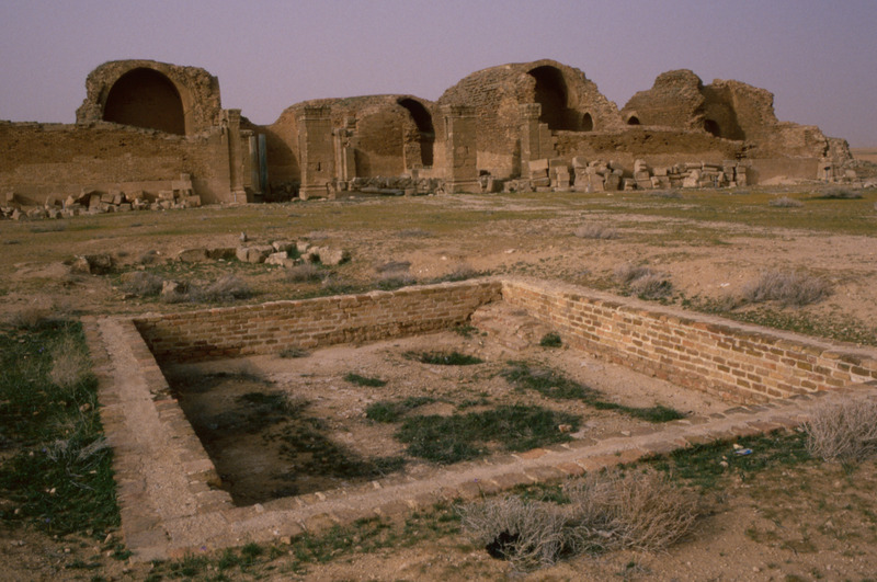 Jordan. Qasr al-Mushatta, within the walls of Mushatta, a small pool and the standing remains of the triple-apsed throne room and adjacent rooms