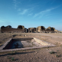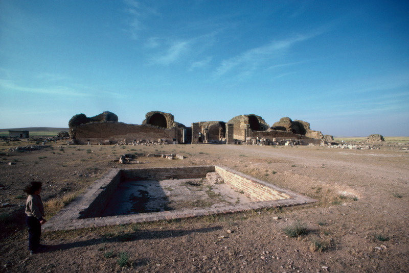 Jordan. Qasr al-Mushatta, within the walls of Mushatta, a small pool and the standing remains of the triple-apsed throne room and adjacent rooms