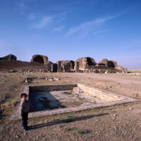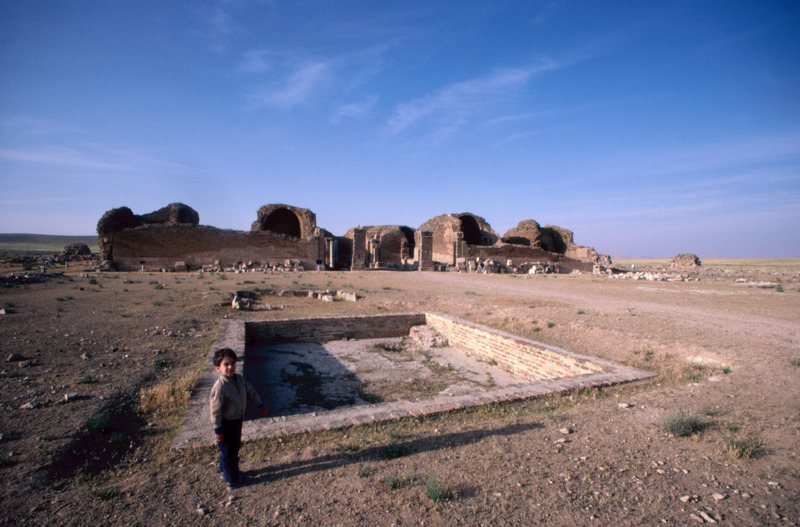Jordan. Qasr al-Mushatta, within the walls of Mushatta, a small pool and the standing remains of the triple-apsed throne room and adjacent rooms