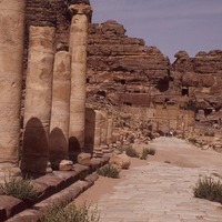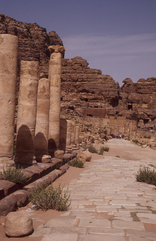 Jordan. Petra, the Colonnaded street inside Petra, showing the typical curved surface and regular blocks of paved Roman streets