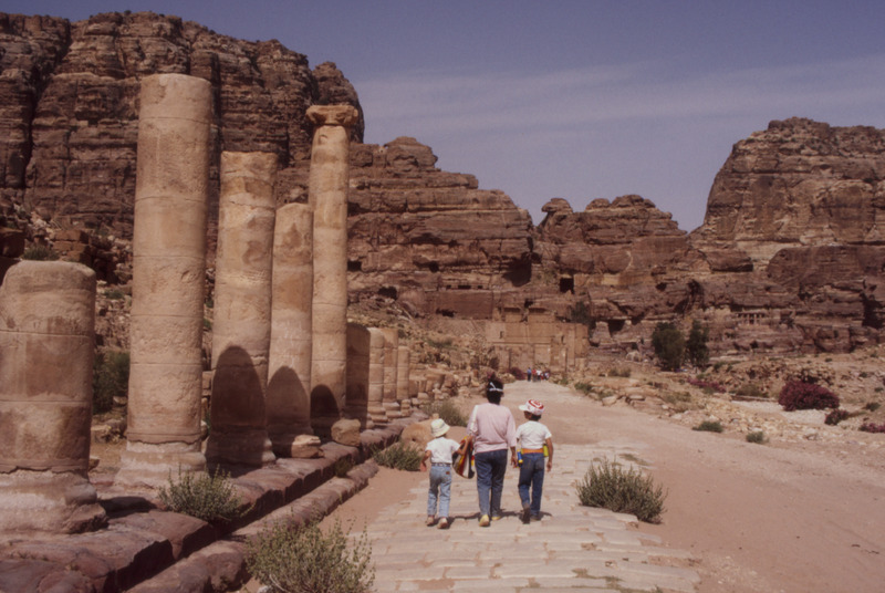 Jordan. Petra, the Colonnaded street inside Petra, showing the typical curved surface and regular blocks of paved Roman streets