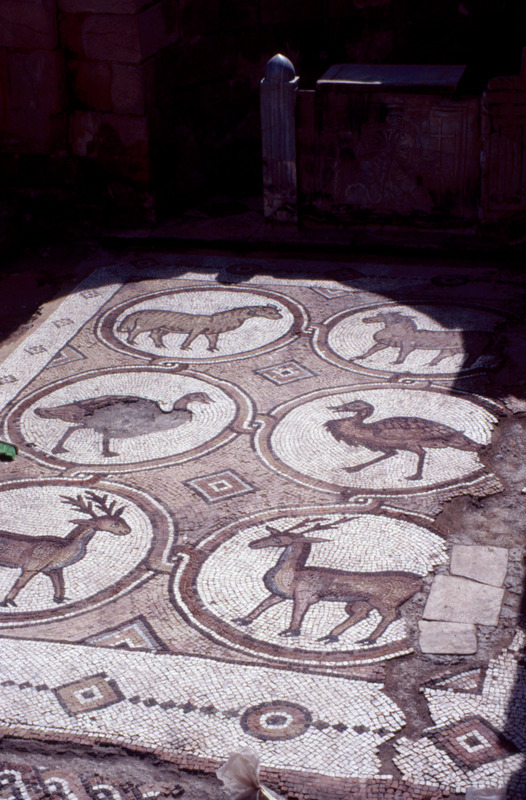 Jordan. Petra, The Petra Church, eastern section of mosaic floor of south aisle and marble furnishings of the adjacent south apse